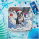 A heartwarming holiday illustration featuring a cheerful dog playing in the snow, wearing a Santa hat and surrounded by colourful gift boxes. In the background, children build a snowman beside a snow-covered Christmas tree, creating a joyful winter wonderland. Perfect for spreading holiday cheer and capturing the magic of Christmas.
