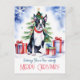 Boston Terrier Merry Christmas greeting postcard for dog people, watercolor cute Boston Terrier puppy by gift boxes and Christmas tree, Christmas postcard for dog lovers