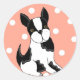 A cool looking Boston Terrier on a coral background with white polka dots.
