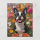 A charming Boston Terrier sits happily in a vibrant wildflower field, surrounded by bursts of colourful blossoms in pink, yellow, and purple. This lively artwork captures the joyful energy of the breed and the beauty of nature in full bloom.