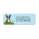 Le côté gauche de ces étiquettes d'adresse de retour présente l'image d'un adorable chien de chiot Boston Terrier assis dans un jardin de fleurs de jonquilles de printemps jaunes et de feuillage vert. A droite, votre texte personnalisé est en vert et noir. Tout est posé sur un arrière - plan bleu clair.
