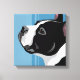 Contemporary illustrated Boston Terrier profile portrait with blue background on wrapped canvas.