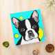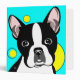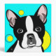 Cute Boston Terrier flat colour illustration on an aqua background with yellow circles and editable text on spine
