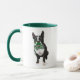 Boston Terrier With Green Moustache And Spotty Mug