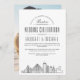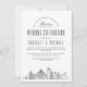 It features a modern deco-style illustration of the city's skyline resting towards the bottom. Centred above this are the names of the wedding couple and your wedding day information in matching open-lined style text. This is all together presented in a neutral black and white, classic colour theme.
