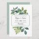 Vintage botanical wedding invitation displays your wedding details uniquely arranged in inky off-black block and calligraphy lettering, on a background of painted green watercolor leaves, branches, ferns and foliage. Invitations reverse to solid sage green.