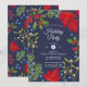 Elegant holiday party invitation. Illustration with bright maple, holly, mistletoe and juniper on dark blue background. Add your text.