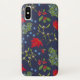 Elegant iPhone case with botanical autumn illustration. Bright maple, holly, mistletoe and juniper pattern on dark blue background.