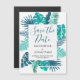 Modern blue green botanical Save the Date magnetic card for a beach or outdoor summer ceremony. This beautiful invite features wild palm leaf foliage surrounding a white rectangle. Perfect tropical destination magnets for a Hawaiian island event.