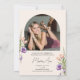 This arch photo graduation party invitation is accented with peach and purple flowers and lush greenery. The elegant layout includes space for two photos and is adorned with delicate handwritten script. Personalize the back with your party details to complete the design.