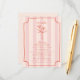 Hand drawn red ticket shaped border, floral line art, and red text over light pink stripe background.