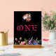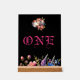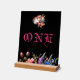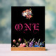 Acrylic tabletop number sign design with an image of a an acrylic painting of wedding bands and soft pastel colored wildflowers.