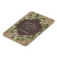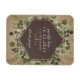 A wedding save the date magnet featuring a botanical design with a chalkboard geometric design over a brown background.