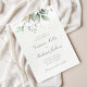 Beautiful Save the date card featuring watercolor eucalyptus and gold leaves.