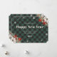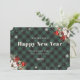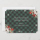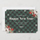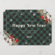 Green buffalo plaid New Year card featuring snowflakes and a watercolor painting of poinsettia, holly and red berries. Easily personalize online.