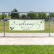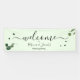 Featuring green eucalyptus leaves on pink for this personalized outdoor banner wedding shower party sign. Elegant and modern 'Welcome' script.