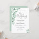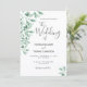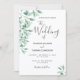 A trendy wedding invitation in white and green. A chic white background on the front. Decorated with green botanical greenery, sprigs and foliage. Modern large handlettered script, typography with the text: The wedding of. Templates for names and wedding details. Dark grey text.