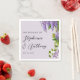 With delicate purple wisteria flowers cascading on one side against a soft, light purple background, they evoke a sense of natural elegance. The addition of black text on the other side, showcasing the event name, the couple's names in a prominent script font, and the memorable date, adds a personalized touch. Overall, these napkins likely bring a graceful and sophisticated aesthetic to any wedding or special occasion.