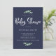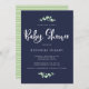 A modern baby shower invitation featuring a solid navy blue background, two green watercolor eucalyptus branches and white font. "Baby Shower" is in modern hand lettered font. The reverse is in leaf green with white stripes.