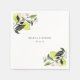 Elegant botanical lemons, leaves and blossoms, personalized paper napkins. Modern design style template provides lines for names and date.