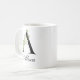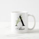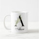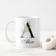 Personalize your morning coffee with this elegant botanical monogram mug. Featuring a classic black serif letter A intertwined with soft watercolor eucalyptus greenery. Easily customize it with your name in a stylish script. A perfect, thoughtful gift for birthdays, bridesmaids, or office coworkers who love minimalist nature-inspired design.