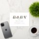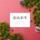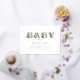 BABY foil text with botanical greenery and poppies over white background with grey text.