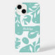 This phone case design features pastel blue abstract shapes on a white background, with white leaves and dots on top. This item also features a section in the centre that you can customize with your own name, or with the name of a friend or family member to give this item as a gift.