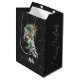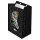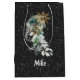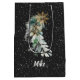 Wrap your holiday gifts in timeless elegance with this medium-sized glossy gift bag featuring a festive watercolor arrangement of pine branches, white berries, pinecones, and gold-toned accents. Set against a rich black background speckled with white snow-like dots, the design evokes a cozy winter night and blends modern rustic charm with botanical Christmas sophistication. The front includes editable text for a custom name, printed in elegant white script, while the side reads “Merry Christmas” in vertical cursive.