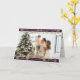 Elegant purple and gold photo Christmas card featuring snowflakes, poinsettia, holly and berries. Easily personalize this purple and gold photo holiday card with your photo and text.