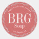 Delicate botanical round frame with customizable Thank you for your purchase text, monogram initials, type of product, in this case soap, and location where business started. Ideal for after purchase packaging. White lettering on indian red or chestnut rose background.