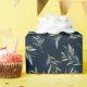 Winter Christmas seamless repeat pattern from branches with golden and blue leaves on the dark blue background.