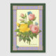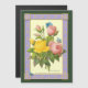 A magnet card with an antique reproduction of pink and yellow rose flowers botanical artwork by famous artist Pierre Redoute with blue butterflies. The faux frame is created with vintage printers' marks in golds on blue against a deep green faux canvas background.