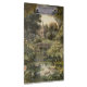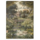 vintage painting of a botanical scene of swans swimming in the water in an English garden with water lilies, bridges and many exotic flowers