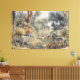 vintage painting of a botanical scene with zebras in an oasis with palm trees and lions roaming by the river