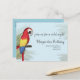 This design features a cute wild birds animal party, a tropical beach pool outdoor party, a colourful jungle parrot wildlife cute, a simple minimalist minimal modern, a stylish trendy calligraphy script, a botanical palm tree leaves leaf, with tropical green greenery foliage, a whimsical cute fun party invitations, a simple fun summer birthday party, a botanical jungle paradise island a budget-friendly postcard