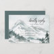 Cette belle carte RSVP de montagne enneigée présente une scène alpine aquarelle avec des arbres à feuillage persistant sur un arrière - plan de blanc éclatant. Les mots "Kindly response" sont dans une police de style calligraphie à la main. Le dos de la carte a un arrière - plan vert forêt. Les noms de la mariée et du marié et la date du mariage sont en blanc.
