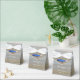 This design features a a bottle laying on the beach. The beautiful blue bottle colour contrasts against the golden sand creating a perfect match. The white fine lined border perfectly frames the washed up blue bottle on the sand and matches the modern white coloured typography. Romantic beach design with a blend of simplicity and elegance. This design is ideal for a beach destination or blue themed wedding. The perfect summer blue beach wedding favour box design. Matching wedding invitations and other stationery items are also available.