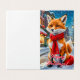 Illustration d'un joyeux renard anthropomorphe assis dans la rue animée de la ville, aujourd'hui transformé pour la saison des fêtes. Le renard, orné d'une écharpe rouge ludique et d'un chapeau de Père Noël minuscule, rayonne de joie. L'arrière - plan urbain est dépoussiéré de neige douce et blanche, créant une atmosphère cosy et festive. Les flocons de neige tombent doucement sur la scène, et les arbres qui bordent le trottoir sont ornés de lumières scintillantes et de décorations colorées. La voiture vintage bleu clair est maintenant revêtue d'une couronne sur le devant, ce qui renforce le charme fantaisiste.