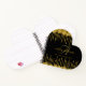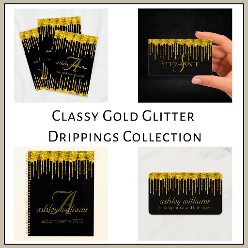 A monogrammed initial/name, gold and black classy notebook appointment book for hair and makeup stylists—with luxury gold glitter drippings and a chic metallic gold background on the back.