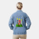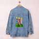 Cette veste en denim pour femmes a un design de Noël de bougies en rectangles décorés d'étoiles, d'ovales ou de diamants avec des arbres regroupés autour du fond.