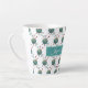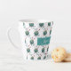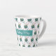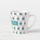 Fils de tricot et aiguilles tasse motif avec endroit pour personnaliser avec un nom. L'exemple de texte est "{Name} tricot mug" dans le script blanc sur le panneau bleu-vert de la mer au centre d'une tasse blanche. Deux aiguilles de tricot collées dans une boule de fil bleu varié font un motif amusant autour de la petite tasse pour le café ou le thé.
