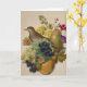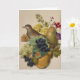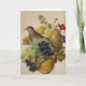 A bird rests on grapes and pears in fall colours with flowers against a golden background. Colourful fall leaves are mixed throughout.