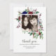 Watercolor floral photo thank you card featuring deep red, burgundy marsala roses, navy blue and blush pink flowers. For matching items and custom edits contact Designer LeahG