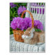 bouquet azalée rose vif en panier en bois avec lapin sur chaise en osier blanc pour penser à vous