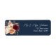 Complétez votre papeterie de mariage avec cette élégante étiquette d'adresse de retour bordeaux et bleu marine. Ornée de roses aquarelles bordeaux, ivoire et pêche avec de l'herbe de pampa et de la verdure sur un fond bleu marine profond, cette étiquette ajoute une touche finale romantique et soignée à vos invitations, cartes de rendez-vous ou cartes de remerciement. Parfaite pour les mariages d'automne et d'hiver. Personnalisez avec vos noms et adresse pour un look stylé et coordonné. Les invitations, cartes RSVP, cartes de détails, menus et pancartes de bienvenue assortis sont disponibles dans notre collection.