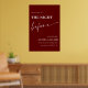 Préparez-vous à votre dîner de répétition avec notre Affiche de bienvenue de la nuit avant la répétition en Bourgogne. Cette enseigne élégante allie des tons bordeaux profonds et riches avec des lettres claires et nettes en blanc, créant une ambiance sophistiquée pour votre célébration pré-mariage. Réalisée à partir de carton ou de panneaux d'affichage de haute qualité, cette enseigne offre une durabilité et une finition polie, assurant ainsi qu'elle se démarque comme un élément central de votre décor événementiel. Personnalisez-le avec les noms du couple, la date du dîner de répétition, l'emplacement et tous les détails supplémentaires pour le rendre unique à votre journée spéciale. Que ce soit sur un chevalet pour une touche classique, encadré pour une élégance accrue, ou directement monté pour améliorer la visibilité, ce panneau d'accueil devient un point focal qui accueille les clients avec chaleur et style. Il donne le ton pour une soirée inoubliable remplie de joie et d'anticipation. Améliorez votre décor de dîner de répétition avec le charme intemporel de notre Affiche de bienvenue de répétition "La nuit avant" de Bourgogne, conçue pour laisser une impression durable à vos invités et compléter la beauté de votre célébration mariage.
