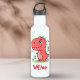 Cette bouteille d'eau personnalisée pour enfants présente un bébé dinosaure rouge sucré avec de grands yeux et un sourire amical, se tenant joliment entouré de fleurs et de papillons.