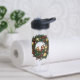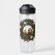 Realistic festive Christmas wreath made of evergreen pine branches with red berries golden baubles and soft glowing lights framing a tiny village of winter houses. Hand painted raster digital illustration on a snowy dark blue background