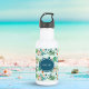 Une bouteille d'eau de dinosaure cool et personnalisée comprend un motif de Tyrannosaurus mignon (T rex), Tricératops, des feuilles de monastères tropicaux, des palmiers, des volcans, des os et "Roar !" texte sur un arrière - plan bleu clair. Parfait pour les enfants amateurs de dino, de retour à l'école, de sports et de loisirs d'été. Image originale KL Stock