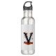 At the base of the 'V', resting on a dark, rocky surface, is a cluster of five more brightly lit jack-o'-lanterns, all carved with different, spooky faces. Several black bat silhouettes are visible, flying around the 'V' and the moon, completing the classic Halloween motif.
